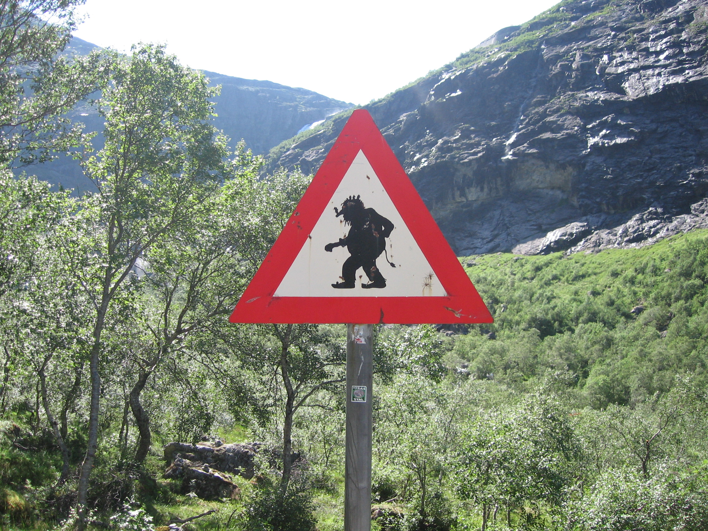 Procedentes de la mitología escandinava, los trolls están muy presentes en la vida rural noruega a través de los cuentos y leyendas tradicionales. A grandes rasgos, se representan bajo dos formas: los grandes, de piedra y muy feos, viven en las montañas y sólo salen por la noche bajo distintas apariencias para poder engañar al ser humano. Los pequeños se parecen a los duendes, viven en grupo en los bosques y cazan y pescan. De hecho, en la carretera hay señales que alertan de su presencia 😉